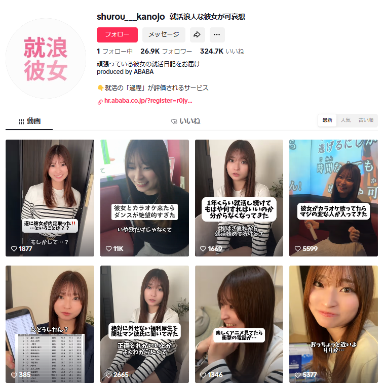 また、運営会社・ABABAのプロデュースで、「就活浪人な彼女が可哀想」という名のアカウントも運用されています。