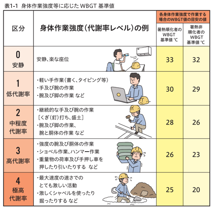 まず必要なのは、作業場の環境を整えることです。そのためには、職場のWBGT値を把握し、以下の表をもとに基準値と比べましょう。