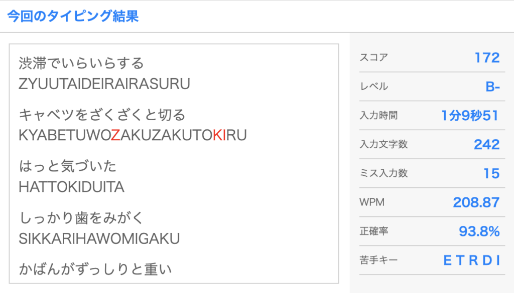 ちなみに本記事執筆現在、e-typingを利用しているユーザーの平均スコアは222.84でした。