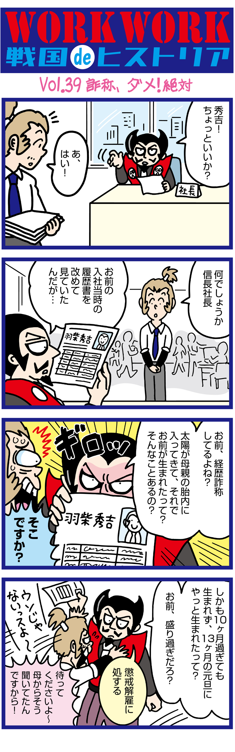 WorkWork戦国ヒストリア 第39話「秀吉の経歴詐称?!詐称ダメ!絶対」歴史×求人・採用情報を漫画で学ぶ
