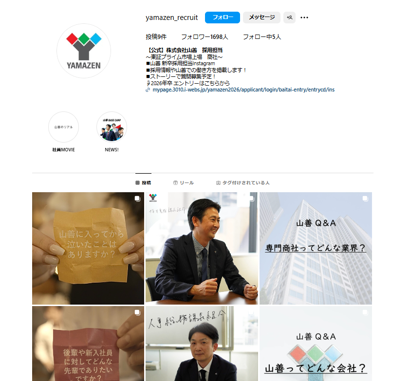 株式会社山善はInstagramを活用し、自社の製品やサービスの魅力を伝えながら、企業文化や働く環境を紹介。社員の日常も積極的に発信することで、親近感を抱きやすいアカウント作りに成功しています。