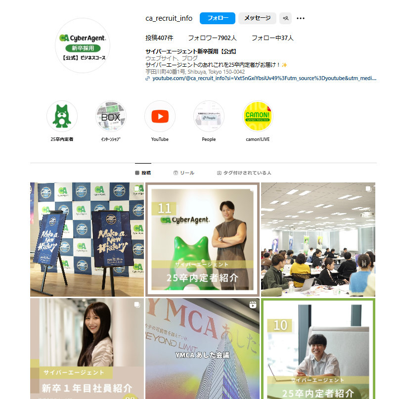 株式会社サイバーエージェントは新卒採用に力を入れており、Instagramを活用して自社の魅力を発信している企業です。インターンシップの様子や社員のインタビュー動画、オフィス環境の紹介など、多様なコンテンツを発信することで、若年層の興味と関心を集めています。