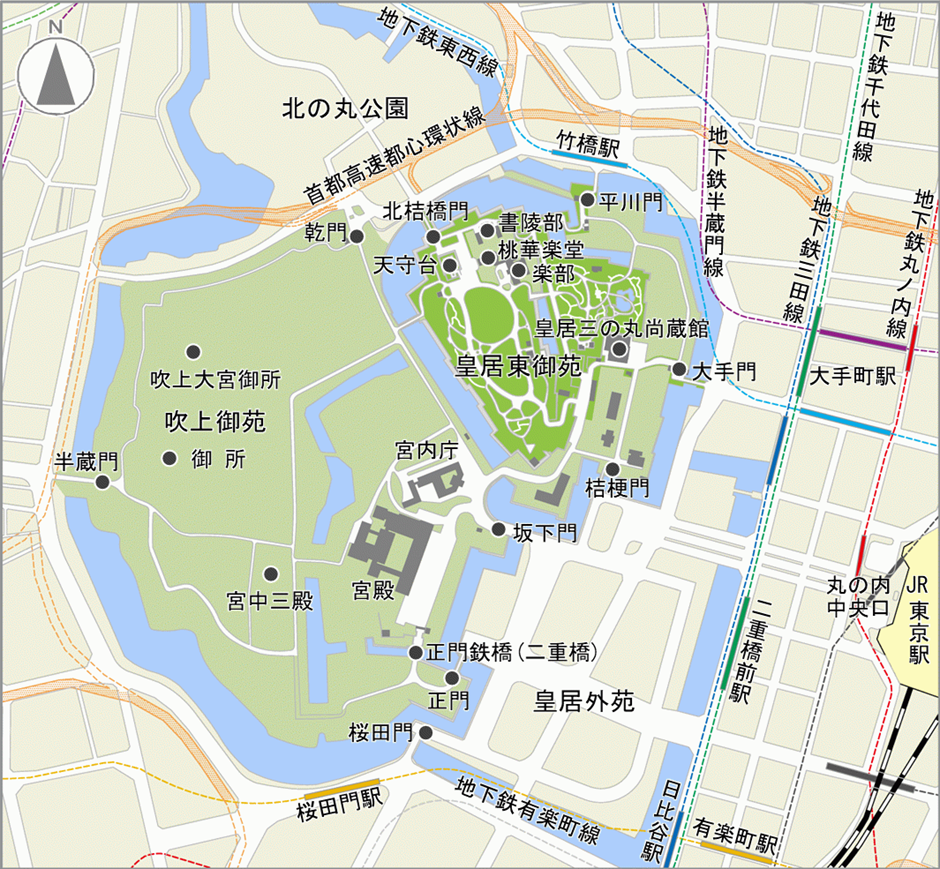 また、皇居は大きく「皇居東御苑」「皇居外苑」「宮殿地区」「吹上御所」の4つに分かれます。