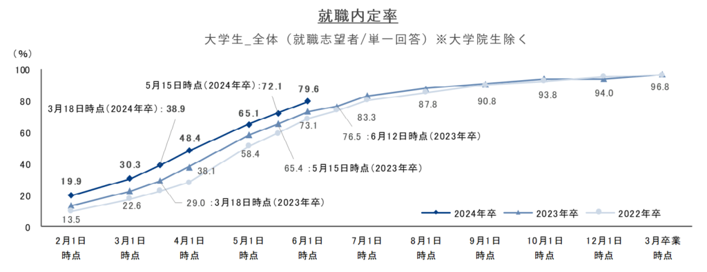 引用:就職プロセス調査(2024年卒)「2023年6月1日時点 内定状況」