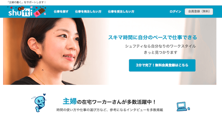 シュフティ (Shufti)は主婦(夫)やスキマ時間に副業したい人を対象としたクラウドソーシングサービスです。
